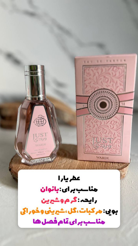 ادکلن زنانه فراگرنس ورد مدل جاست وردی Just Ward مشابه رایحه یارا صورتی از رایحه ای شیرین و گرم برخوردار است. عطر ادکلن Just Ward عطری عربی با رایحه ای شیرین وانیلی و پودری هست. ظاهر خاص و منحصر به فرد ادکلن Just Ward این ادکلن عربی را با بقیه عطر های عربی متمایز کرده است.