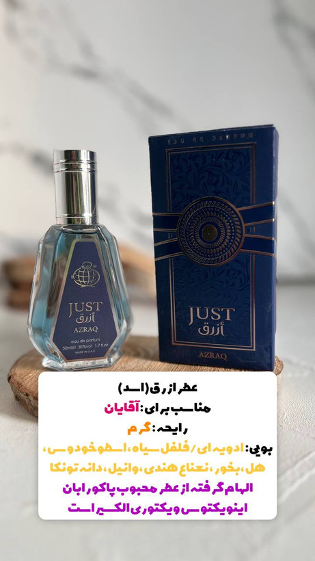 ادکلن فراگرنس ورد مدل جاست ازرق Just Azraq رایحه ای تازه و حسی از اسطوخودوس ملایم و ادویه های تند برای مردان. فلفل سیاه، اسطوخودوس و هل رنگ های روشن و تند را باز می کنند. با باز شدن شکوفههای اسطوخودوس، رایحههای مجلل پروونس پخش میشوند. رایحه بخور و نعناع هندی در نت های قلبی به عمق و اشتیاق می افزاید. عطر در انتها ملایم می شود و با باز شدن نت های وانیل و دانه تونکا شیرینی ملایمی به خود می گیرد. رایحه ای روشن، اما در عین حال لطیف، که برای کادربندی هر روز عالی است.